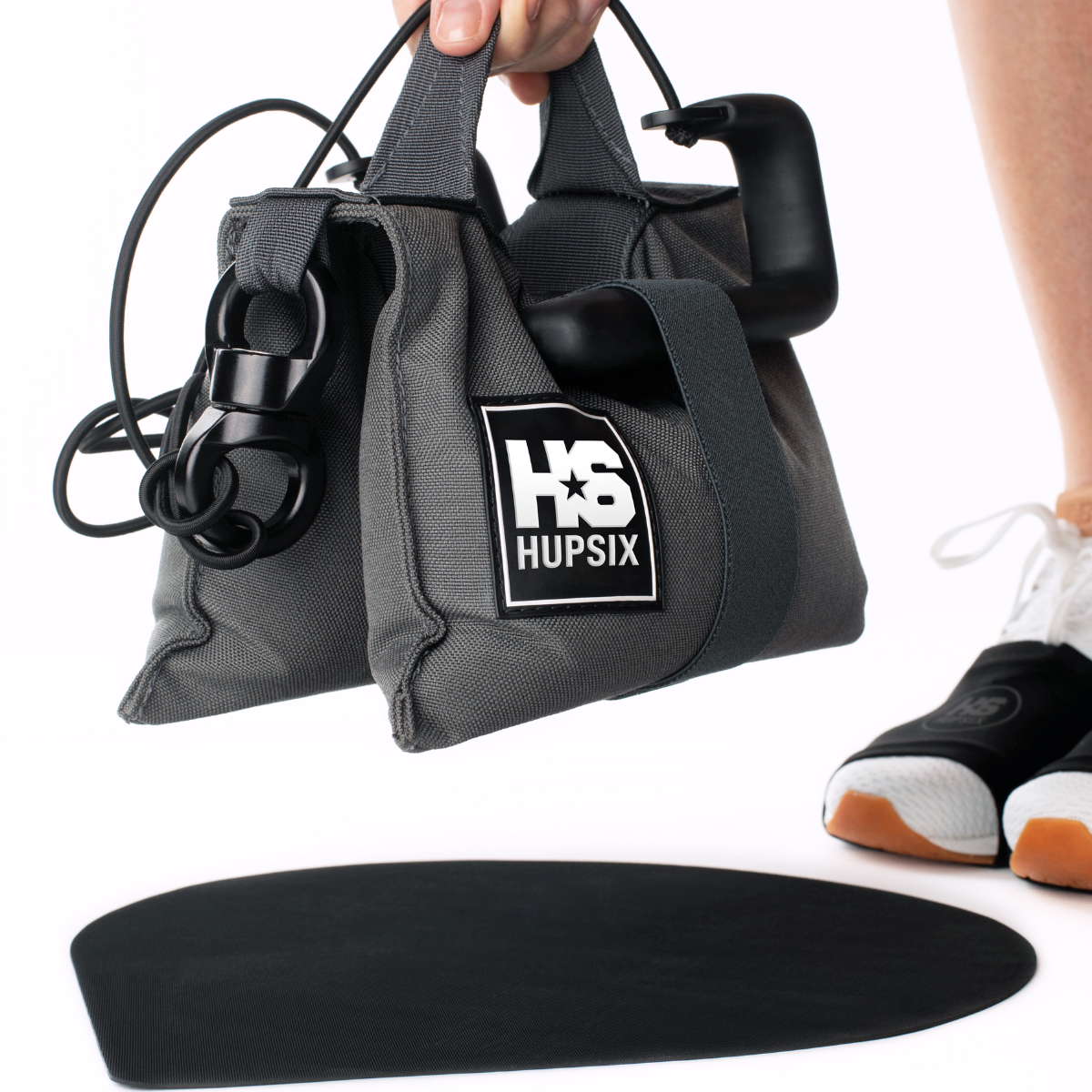 The HupSix Bag is filled with 20 pounds of Pennsylvania steel shot making it 3x smaller than a sandbag and supple if stepped on. It sits on a non-slip mat and includes a Rock Exotica Ball Bearing Swivel for tangle-free turns.